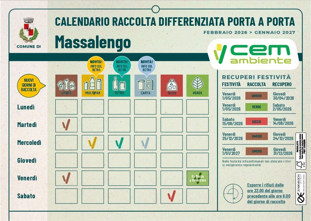 Calendario della raccolta porta a porta a partire dal 1 febbraio 2026